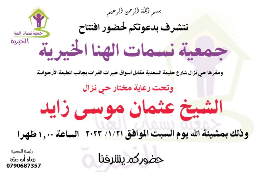 برعاية الشيخ ” عثمان موسى زايد” سيتم إفتتاحِ جمعيه * نسمات الهنا الخيريه * يوم السبت المقبل