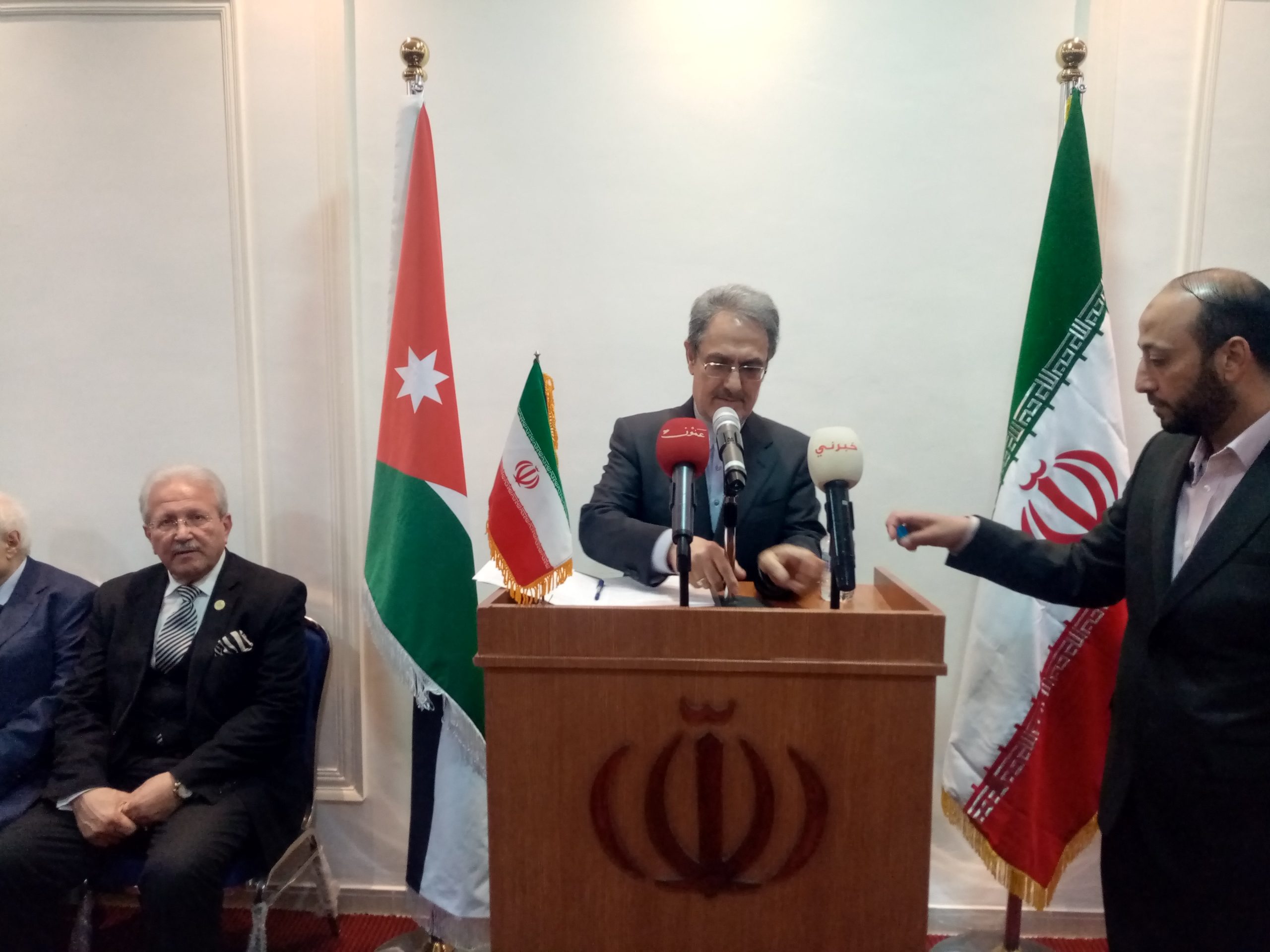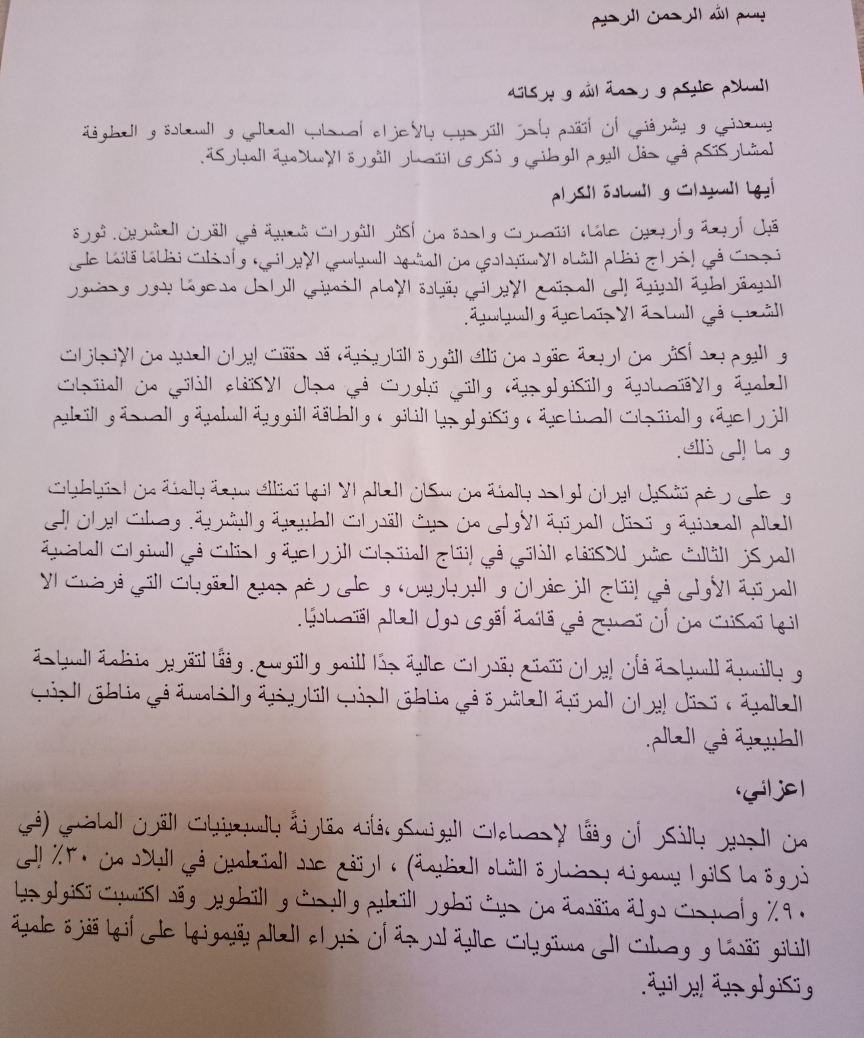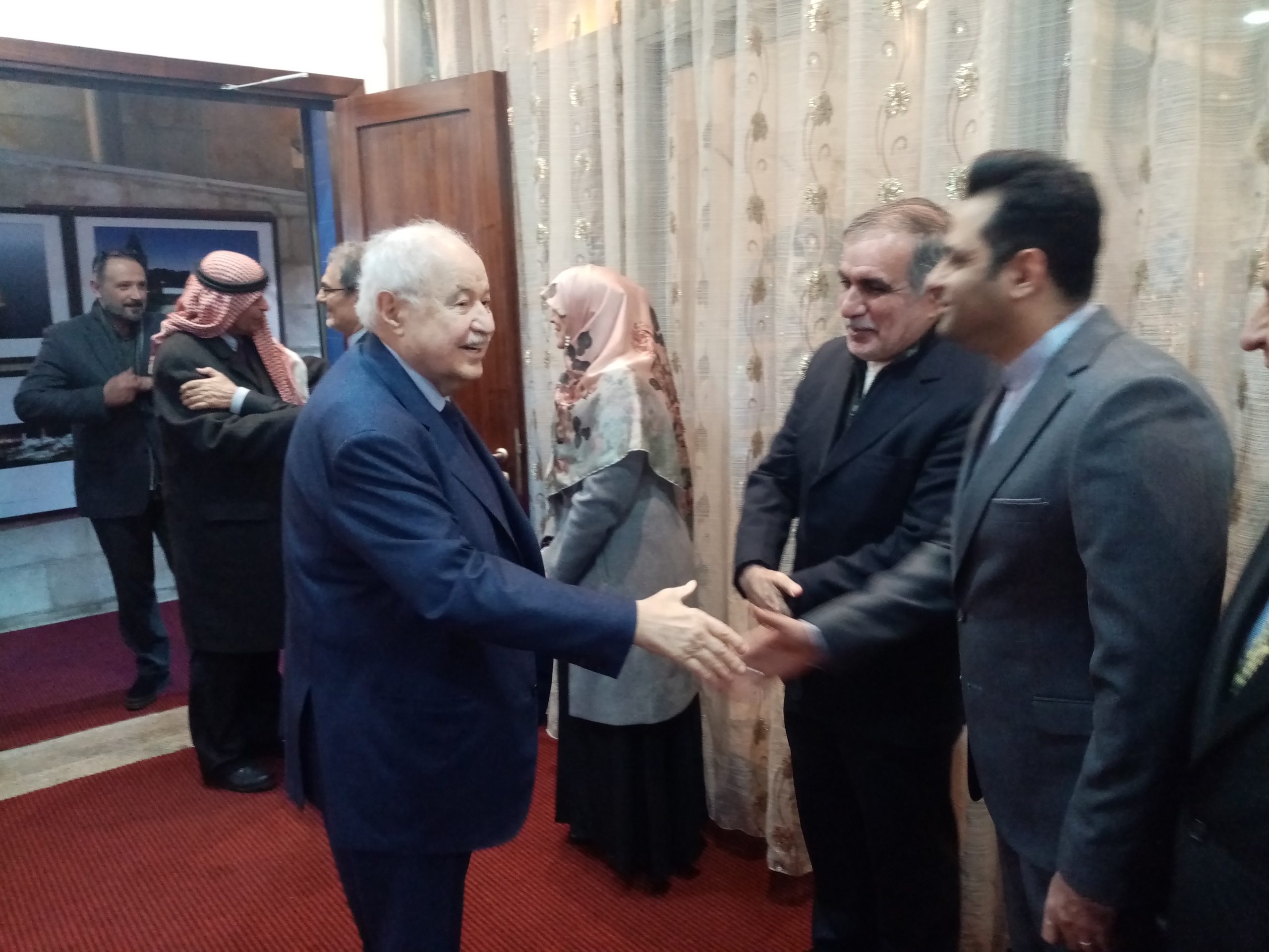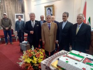 شبكة الشرق الأوسط نيوز – محيي الدين غنيم : أقام سعادة سفير الجمهورية الإسلامية الإيرانية في عمان الأستاذ علي أصغر ناصري، حفل إستقبال، بمناسبة حلول الذكرى الرابعة والأربعون لإنتصار الثورة الإسلامية في إيران، وحضر الحفل أعضاء السلك الدبلوماسي في الأردن ومن ضمنهم السفير الفلسطيني المفوض الاستاد فاروق العزة وسعادة السفير السوري ونائبة السفير القطري، سعادة السيدة / نور بنت خليفة خميس المسلماني وعدد من سفراء الدول العربية والإسلامية والأجنبية، وبحضور دولة رئيس الوزراء الأسبق، الدكتور عون الخصاونة ومعالي الدكتور جواد العناني وسعادة الدكتور طلال أبو غزالة وسعادة الدكتور سفيان التل والمحامي الدكتور فيصل الخزاعي الأستاذ خالد السكجي ورئيس بعثة الصليب الأحمر في الأردن، الدكتورة نهال حفني ورئيس مجلس الإدارة مجموعة المنار للتعليم والإستثمار الأستاذ عزمي عودة والداعية الشيخ مصطفى رمان والأستاذ عاطف الكيلاني ناشر موقع الأردن العربي والمحامي والمحلل السياسي الأستاذ محمد الروسان والاستاذ حمادة فراعنة والمحامي الأستاذ سامر أبو شندي والكاتب والمحلل السياسي الأستاذ أحمد القيسي والإعلامي مروان سوداح وحضور عدد من الشخصيات والفعاليات السياسية، وقد ألقى سعادة السفير الإيراني الأستاذ علي أصغر ناصري كلمة ترحيبية بالحضور وتاليا نصها :