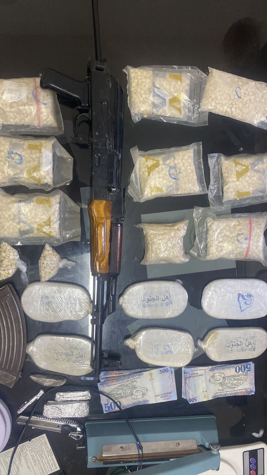 وفي محافظة العقبة وبعد جمع المعلومات ومتابعة احد تجار المخدرات ممن يقومون بتزويد المروجين بتلك المواد ، والتأكد من حيازته لكميات كبيرة من المخدرات جرت مداهمة منزله والقاء القبض عليه وضبط بحوزته 700 غم من مادة الكوكايين و 10 آلاف حبة مخدرة و 1 كغم من مادة الحشيش وسلاح ناري .