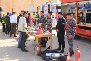 وعلى هامش الاحتفال أقيم معرض لآليات ومعدات الدفاع المدني الحديثة والمتطوره في كافة محافظات المملكة تخلله توزيع البوسترات والمطويات التثقيفية التوعوية بالإضافة إلى إجراء فحوصات لقياس الضغط والسكري لزوار المعارض.