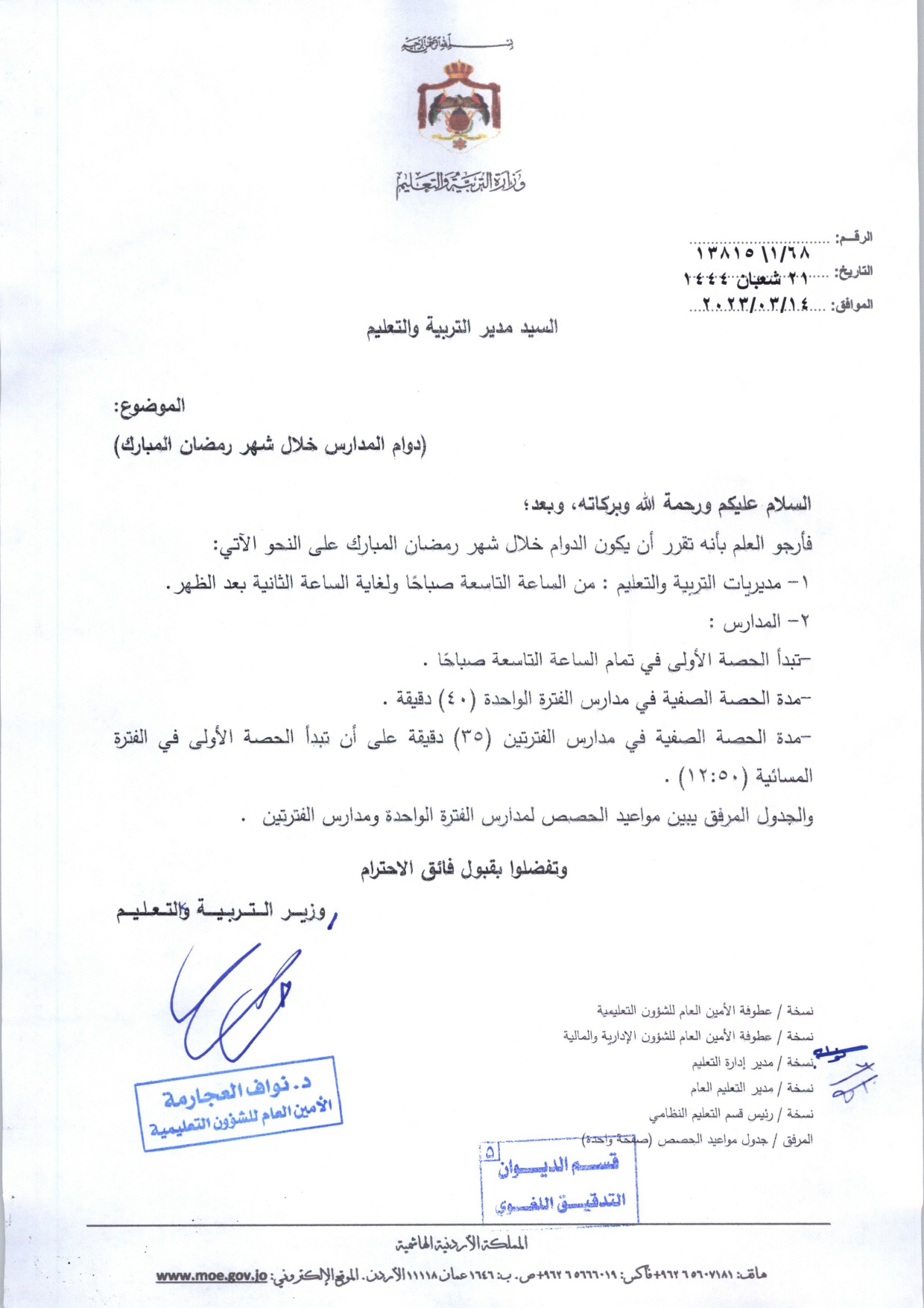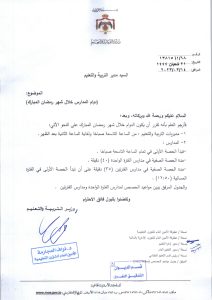 شبكة الشرق الأوسط نيوز : أعلنت وزارة التربية والتعليم أوقات الدوام للمديريات والمدارس خلال شهر رمضان المبارك، حيث يبدأ دوام الموظفين في مديريات التربية والتعليم الساعة التاسعة صباحا ولغاية الساعة الثانية بعد الظهر.