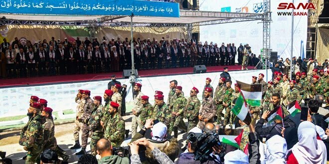 وتضمنت الفعالية التي نظمتها اللجنة الدائمة ليوم القدس العالمي وتحت عنوان (الضفة درع القدس)، عرضاً عسkريا قدمه شباب المخيمات الفلسطينية في سورية، حيث حملت كل سرية اسم مدينة فلسطينية، ورفعت الأعلام الوطنية لدول محور المqاومة، وللfصائل الفلسطينية، وترديد الشعارات التي تؤكد أن القدس ستبقى عاصمة فلسطؤن الأبدية، وأن الاحtلال الصhيوني إلى زوال.