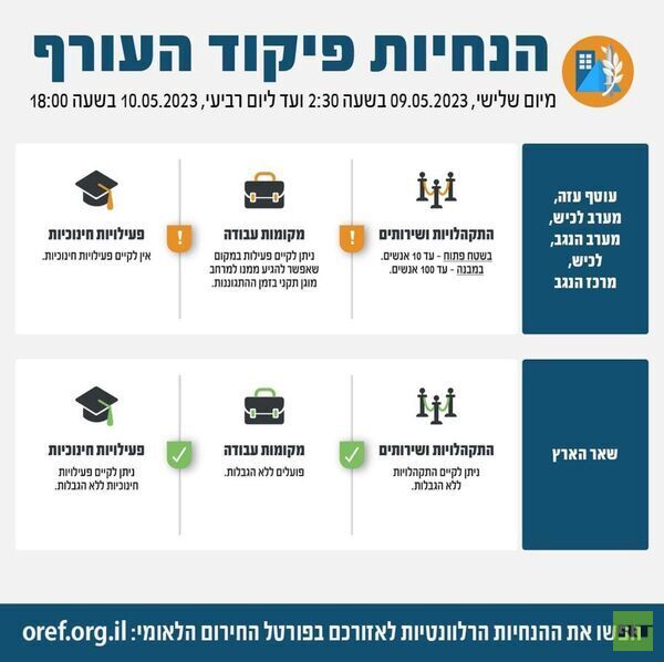 ونشر موقع الطوارئ في إسرائيل، توجيهات خاصة للجبهة الداخلية في المناطق التي تبعد 40 كيلومتر عن قطاع غزة وهي سارية المفعول من يوم الثلاثاء الساعة 02:30 وحتى يوم الأربعاء الساعة 18:00.