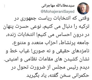«حسرت پنهان» مهاجرانی از انتخابات ریاست جمهوری در ترکیه