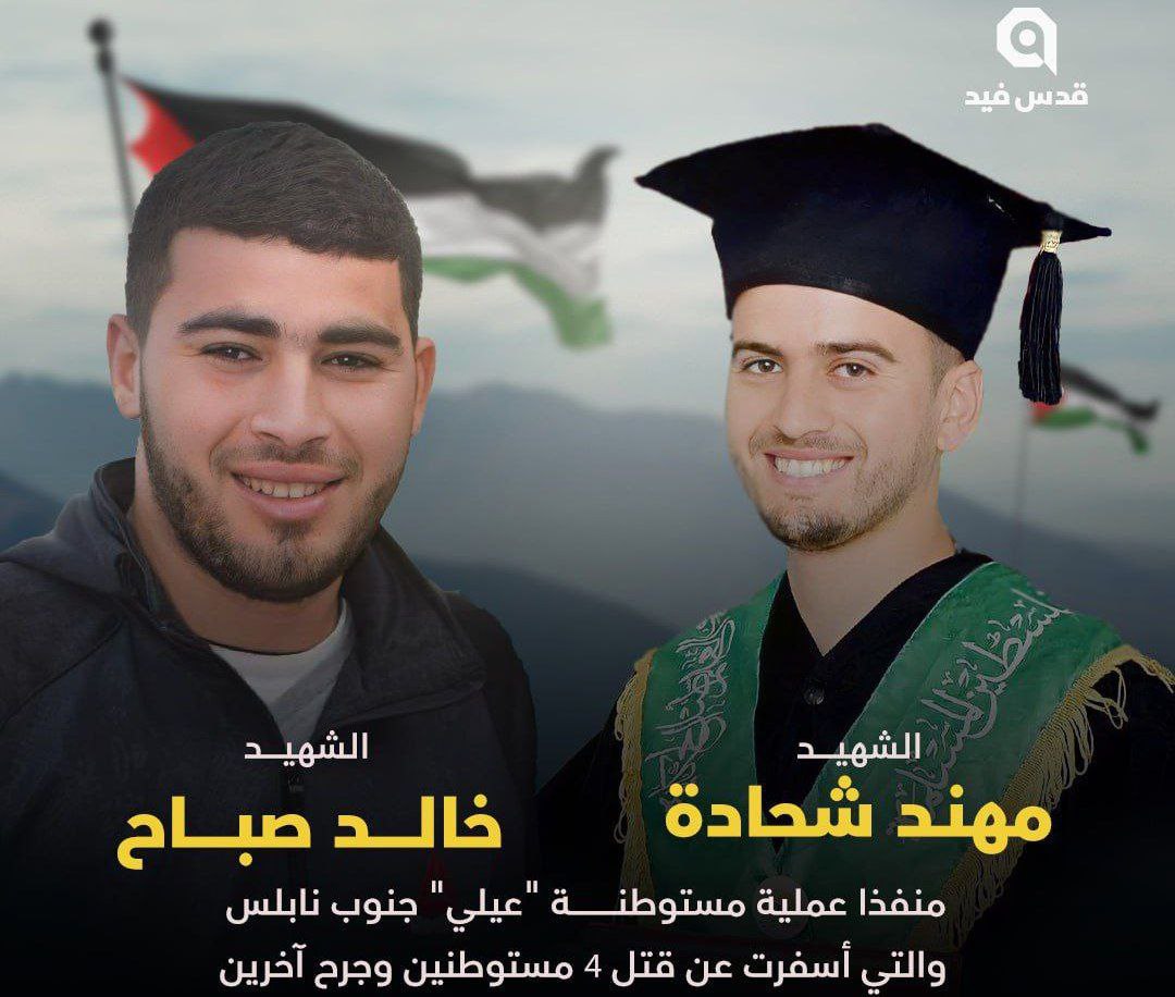 شبكة الشرق الأوسط نيوز – فرهیختگان/ تصاویری از«خالد صباح» و «مهند شحاده»، دو جوان فلسطینی که امروز بعد از عملیات تاریخی منطقه عیلی کرانه باختری که منجر به کشتهشدن ۴ صهیونیست و زخمی شدن ۷ تن از آنان شد، در درگیری با نیروهای اشغالگر به شهادت رسیدند.