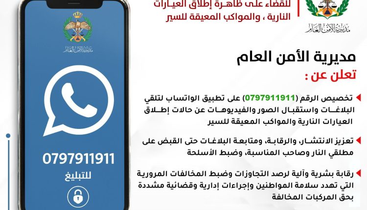 ** تخصيص الرقم (0797911911) على تطبيق الواتساب لتلقي البلاغات واستقبال الصور والفيديوهات عن حالات إطلاق العيارات النارية والمواكب المعيقة للسير.