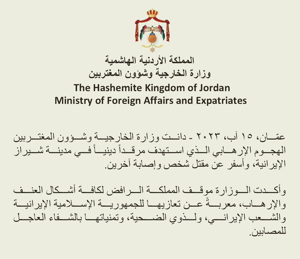 الأردن يدين هجوما إرهابيا استهدف مرقدا دينيا بإيران