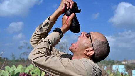 وقطف شاهين عددا من التين الشوكي الأحمر ثم تناوله، وبعدها وضع كمية منه في جورب وبدأ يعصره بيده بالضغط عليه ثم رفعه لأعلى ليشرب عصيره، الذي بدا أحمر للغاية ويشبه الدم.