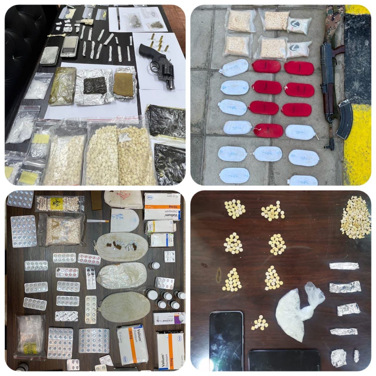 وفي محافظة البلقاء القي القبض على احد المروجين وبحوزته 3 كفوف حشيش وكمية من الحبوب المخدرة ، فيما حددت قوة امنية مكان احد تجار المخدرات النشطين في احدى مناطق غرب البلقاء وعند مداهمته ابدى مقاومة شديدة مستخدما سلاحا ناريا كان بحوزته الا ان القوة الامنية تمكنت من ملاحقته والسيطرة عليه وضبط بحوزته 3000 حبة مخدرة و 4.5 كف حشيش والسلاح الناري المستخدم .