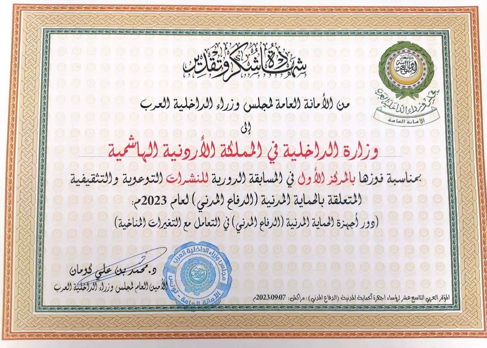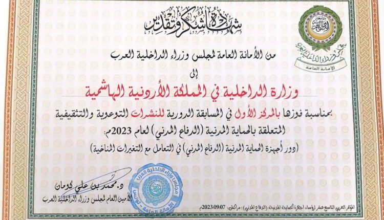 شبكة الشرق الأوسط نيوز : حققت مديرية الأمن العام جائزة عربية جديدة في مجال التوعية، بحصولها على المركز الأول عن أفضل نشرة توعويه تثقيفية، والمركز الثالث عن أفضل فيلم توعوي في مجال الدفاع المدني، ضمن المسابقة التي نظمها مجلس وزراء الداخلية العرب.