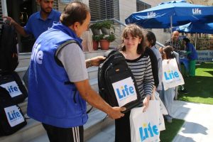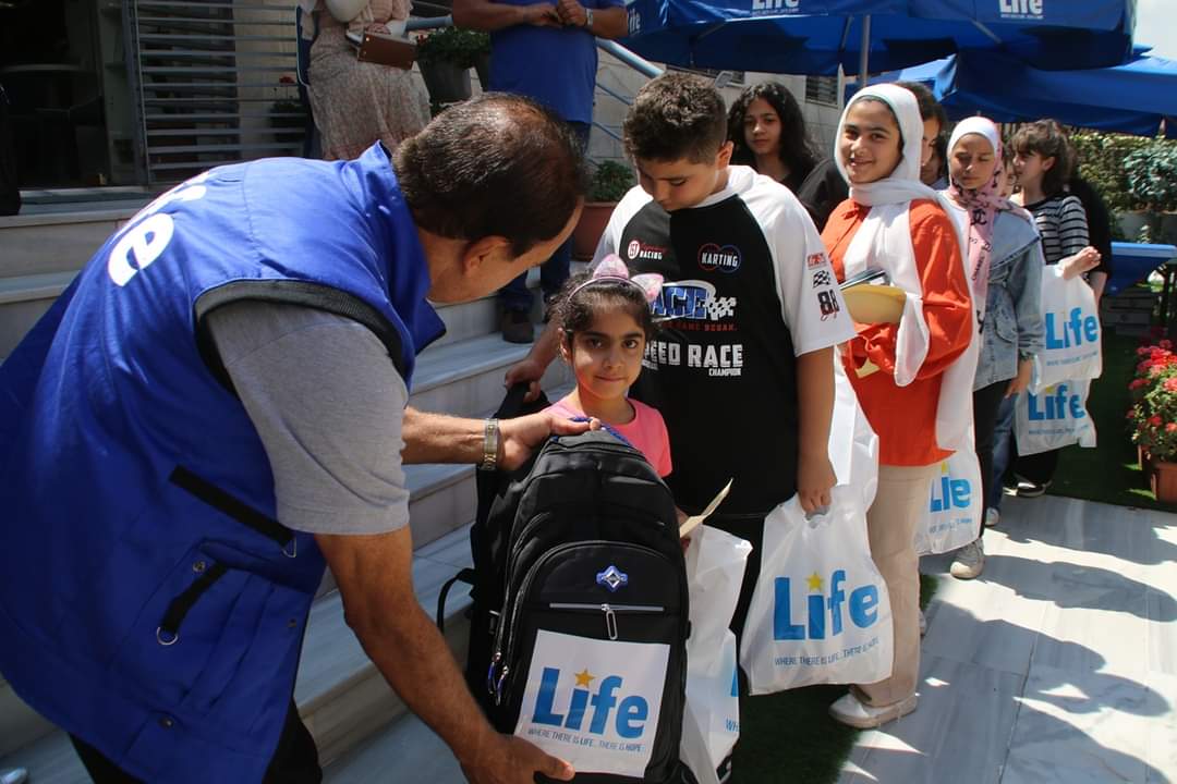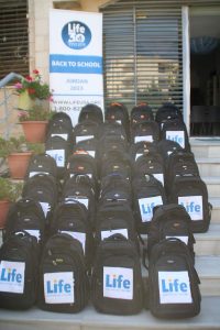 وفي نهاية الاحتفالات قام الدكتور علاونة بتوزيع الحقائب المدرسية على ايناء لايف