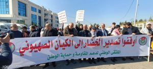 كما رفع المشاركون لافتات كتب عليها: “علموا أولادكم أن فلسطين محتلة وأن المقاومة شرف وأن الكيان الصهيوني عدو والتعامل معه خيانة”، و”كل حبة خضار ترسل إلى الكيان الصهيوني هي رصاصة في صدر كل فلسطيني”.