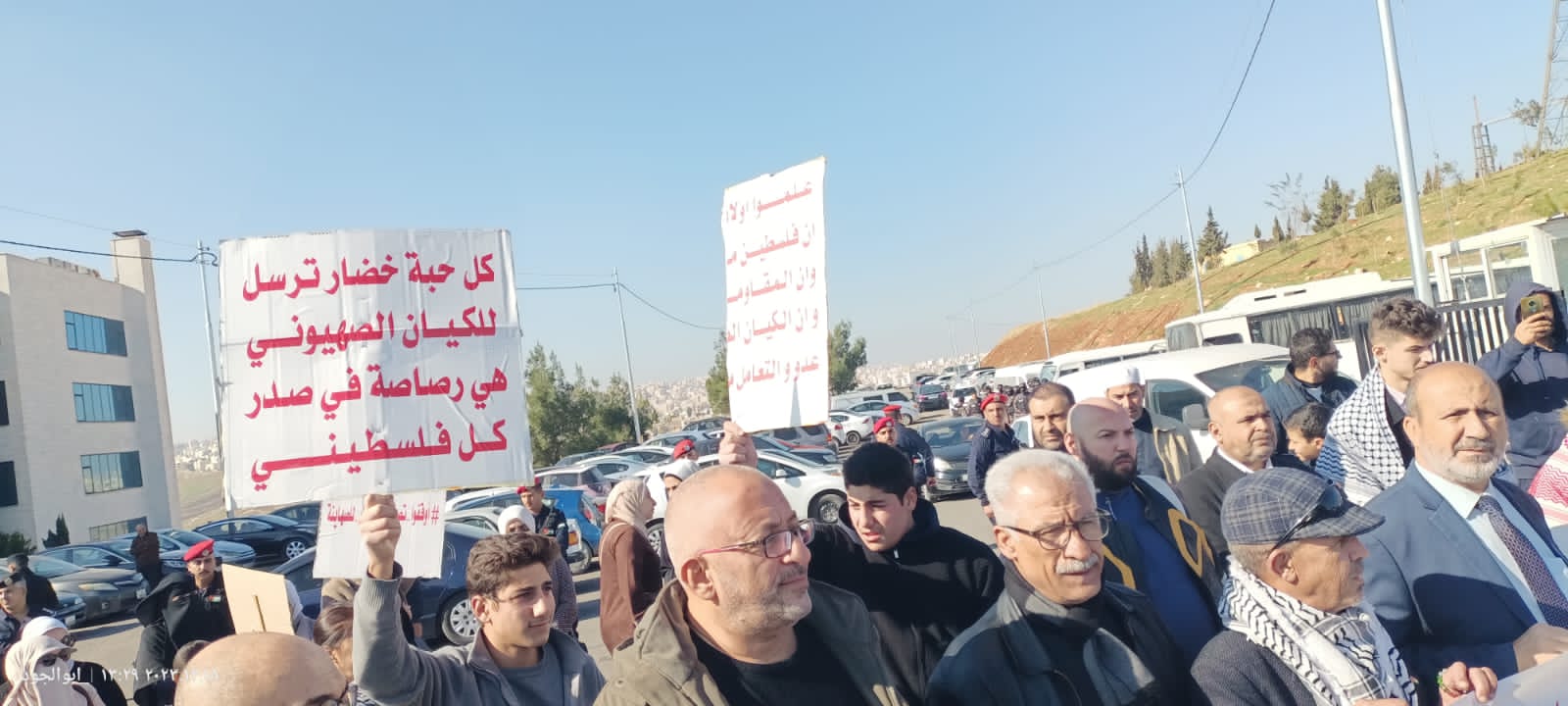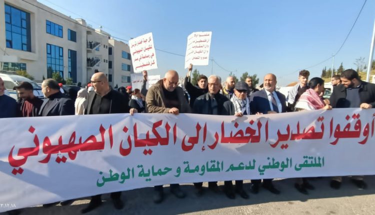 ورفع المحتجون أمام وزارة الزراعة شعارًا منددًا باستمرار التطبيع الزراعي مع الكيان الصهيوني المجرم، ورددوا شعارات: “غزة تحاصر وُتجوّع بينما الخضار تُصدر للاحتلال من أراضينا”، و”أوقفوا تصدير الخضروات للكيان الصهيوني”.