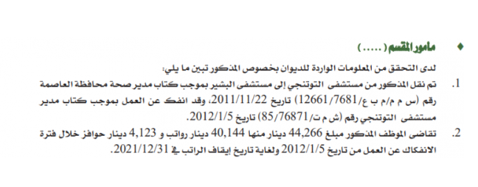” تقرير المحاسبة “: مأمور مقسم مستشفى حكومي يتقاضى 44 ألف دينار دون عمل