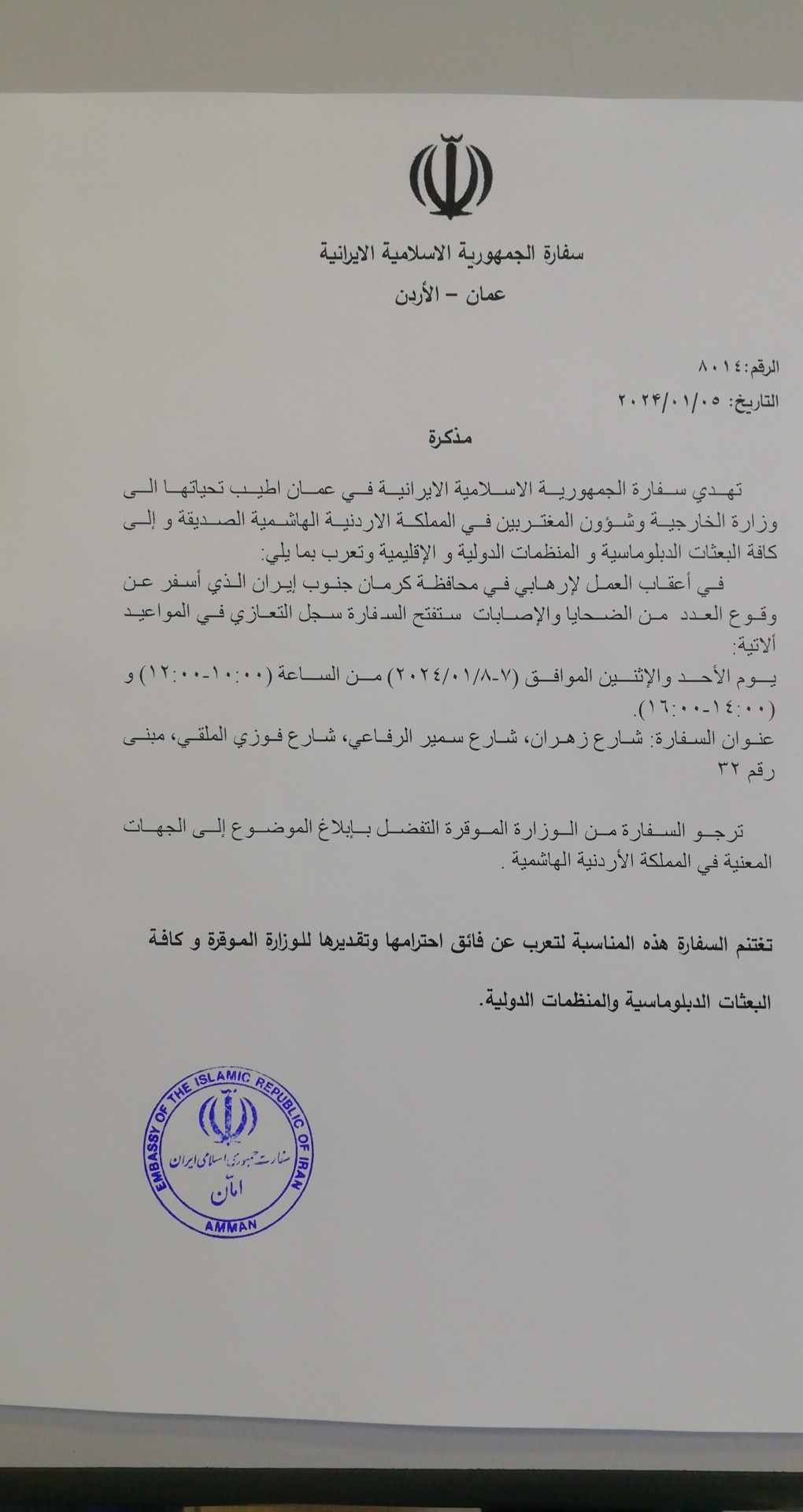السفارة الإيرانية في عمان : فتح سجل التعازي بشهداء كرمان