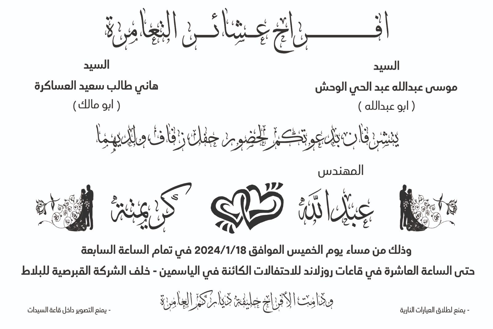 الأستاذ موسى عبد الحي الوحش يحتفل بزفاف نجله المهندس * عبدالله *