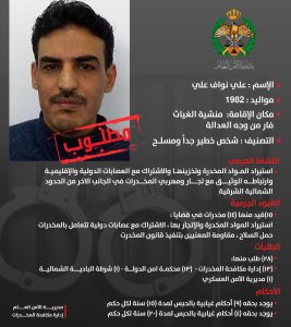 شبكة الشرق الأوسط نيوز : أصدرت مديرية الأمن العام وبالتنسيق مع نيابة محكمة أمن الدولة بيانا نشرت خلاله صور وتفاصيل أخطر المطلوبين بقضايا المخدرات ممن يرتبطون بعصابات دولية وإقليمية لتهريب المخدرات.