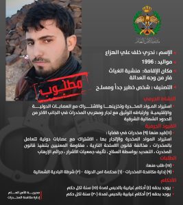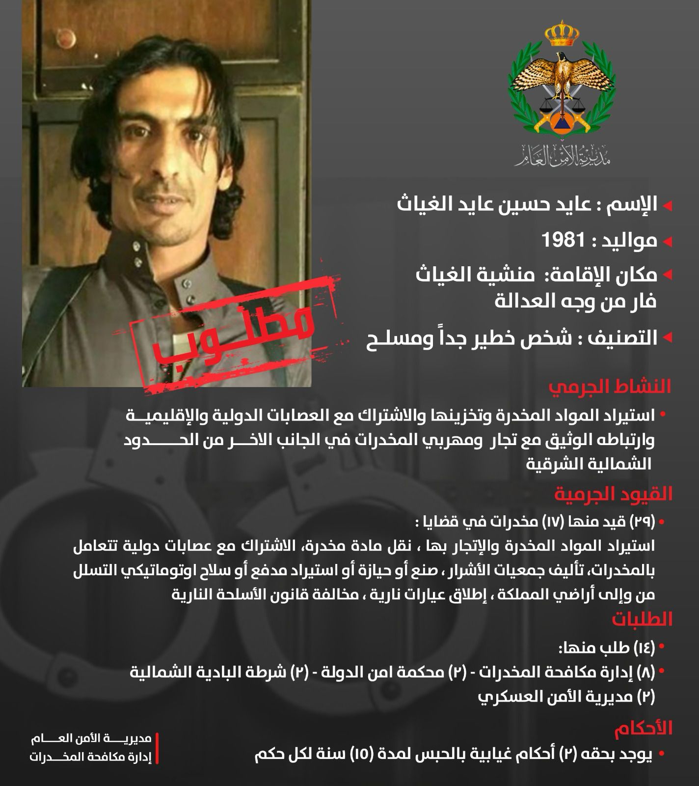 – المطلوبون يشكلون خطراً وتهديداً للأمن الوطني والإقليمي والسلم المجتمعي وبحقهم أحكام غيابية صادرة عن محكمة أمن الدولة، وفارون من وجه العدالة ومصنفون بالخطرين جدا والمسلحين.