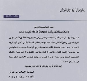 وقالت صحيفة واشنطن بوست عن مسؤول بالمقاومة الإسلامية في العراق: نعلن مسؤوليتنا عن الهجوم الذي استهدف القوات الأمريكية