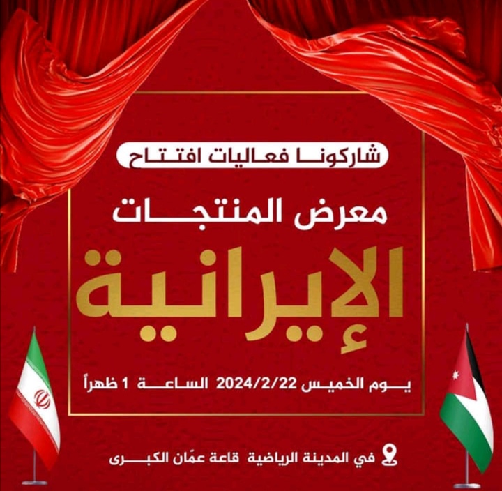 شبكة الشرق الأوسط نيوز – محيي الدين غنيم : تحت رعاية سعادة النائب المهندس خليل عطية، تتشرف سفارة الجمهورية الإسلامية الإيرانية في عمان بدعوتكم لحضور حفل إفتتاح معرض المنتجات الإيرانية، وذلك يوم الخميس الموافق 22/2/2024 في تمام الساعة 1 ظهراً في قاعة عمان الكبرى – مدينة الحسين للشباب / بوابة رقم 1.