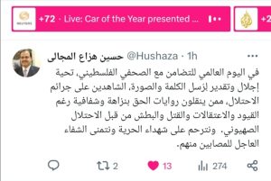 شبكة الشرق الأوسط نيوز – محيي الدين غنيم : نشر معالي حسين باشا المجالي على منصة X تغريدة تضامنا مع الصحفي الفلسطيني، موجها تحية إجلال وتقدير لرسل الكلمة والصورة، الشاهدين على جرائم الاحتلال الصهيوني.
