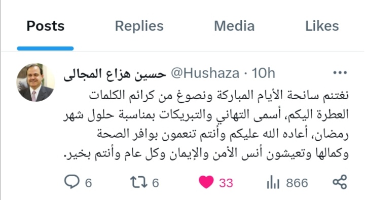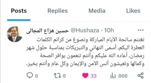 شبكة الشرق الأوسط نيوز : هنأ معالي حسين باشا المجالي من خلال منصة X المواطنين بمناسبة حلول شهر رمضان المبارك … وتاليا نصها :