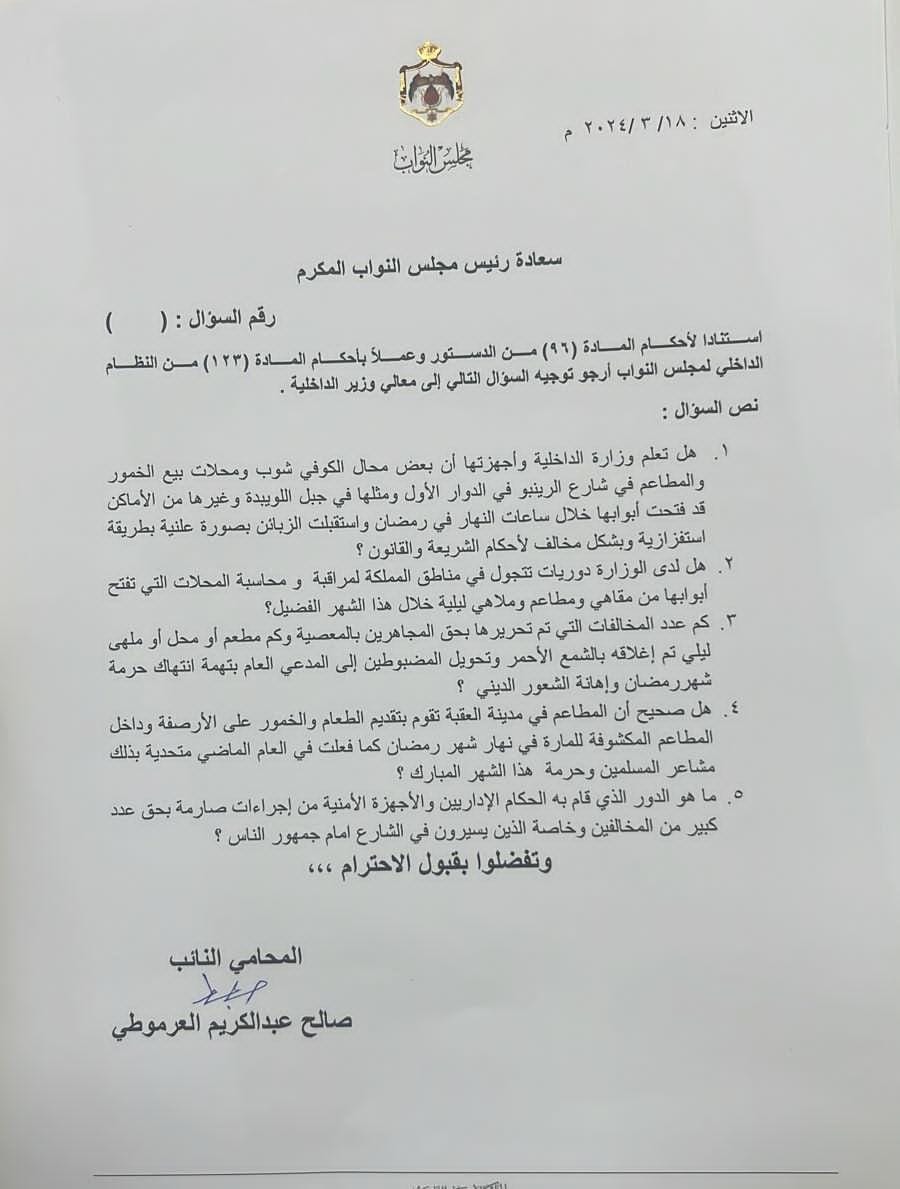 وقال العرموطي في سؤاله: هل تعلم وزارة الداخلية وأجهزتها أن بعض محال الكوفي شوب ومحلات بيع الخمور والمطاعم في شارع الرينبو في الدوار الأول ومثلها في جبل اللويبدة وغيرها من الأماكن قد فتحت أبوابها خلال ساعات النهار في رمضان واستقبلت الزبائن بصورة علنية بطريقة استفزازية وبشكل مخالف لأحكام الشريعة والقانون؟