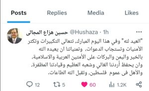 شبكة الشرق الأوسط نيوز – محيي الدين غنيم : نشر معالي حسين باشا المجالي على صفحته عبر منصة X تهنئة بمناسبة حلول عيد الفطر المبارك.. وتاليا نصها :