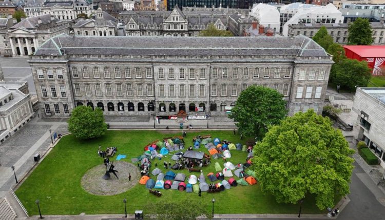 طلبة كلية “ترينيتي” انضموا إلى الاعتصامات المؤيدة لفلسطين، والمُحتجّة على حرب الإبادة الجماعية التي تشنّها “إسرائيل” على قطاع غزة، الجمعة في 3 أيار/مايو الجاري، عندما نصبوا عشرات الخيام في ساحةٍ للكلية، على غرار ما حدث في الولايات المتحدة وأوروبا ودول أسيوية.