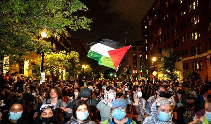 شبكة الشرق الأوسط نيوز : تحدّى طلاب متضامنون مع الفلسطينيين في جامعة جورج واشنطن في العاصمة الأمريكية الشرطة الأمريكية، وأقاموا مخيما في الشارع اليوم الجمعة بعد إقدام الشرطة على إخلاء مخيّم في حرم الجامعة بالقوة يوم الأربعاء الماضي. وكانت الشرطة هاجمت المخيم واعتدت على الطلاب واعتقلت العشرات في مواجهة مع المتظاهرين احتجاجا على الهجوم الإسرائيلي على غزة.