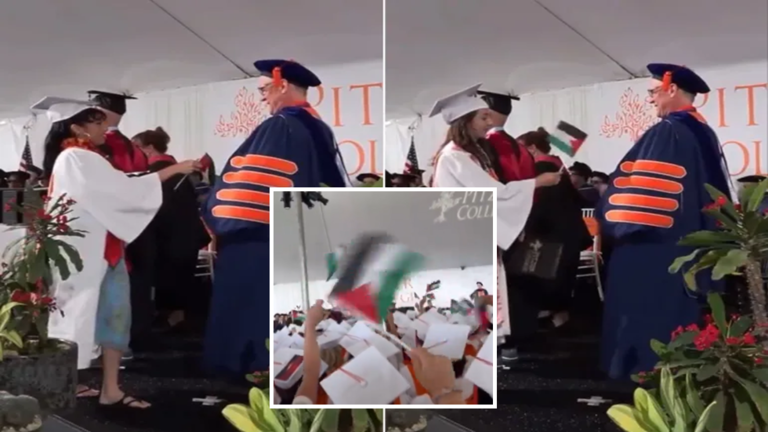 ولدى صعود كل واحد منهم للتكريم، يقوم بمصافحة رئيس الكلية ستروم ثاكر ويمنحه علما فلسطينيا، ليتسلمه منهم ويعطيه لشخص آخر بجانبه.