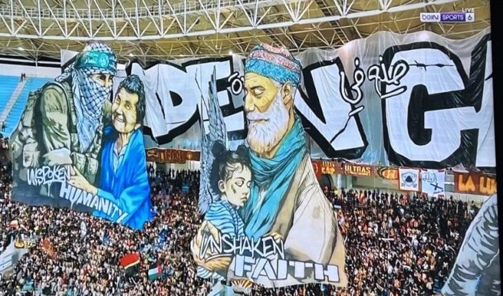 ورفعت جماهير الترجي يافطات كتبت عليها: “صنع في غزة” و”أرض حرة في عالم محتل.. هذه هي قيمنا النبيلة” و”نحنُ نقفُ مع فلسطين”.