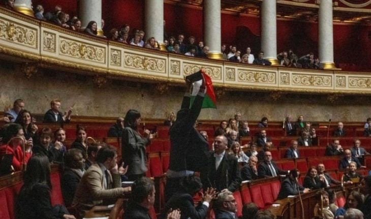شبكة الشرق الأوسط نيوز : خلال جلسة عامة للجمعية الوطنية الفرنسية، قام النائب البرلماني عن حركة “فرنسا الأبية” اليسارية الراديكالية سيبستيان دلوغي برفع علم فلسطين رداً على ما يحدث في غزة، في خطوة قابلتها رئيسة الجمعية الوطنية المنتمية لمعسكر الرئيس إيمانويل ماكرون، يائيل برون-بيفيه، التي لا تخفي دعمها لإسرائيل، بتعليق الجلسة، قبل أن تتم لاحقاً معاقبة النائب البرلماني المعني، وسط جدل مستمر حول هذه الحادثة.