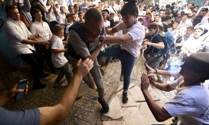 وأوضحت صحيفة “هآرتس” العبرية أن مراسلها نير حسون تعرض لهجوم من شبان مشاركين في مسيرة الأعلام في البلدة القديمة، وقام بعضهم بطرحه أرضا وركله حتى تدخلت الشرطة.