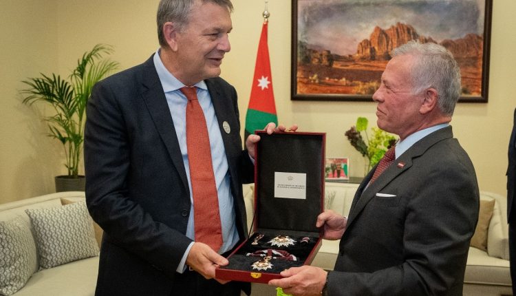 وسلم جلالته الوسام للمفوض العام لوكالة أونروا، فيليب لازاريني، خلال لقائه به على هامش مؤتمر الاستجابة الإنسانية الطارئة في غزة، بحضور سمو الأمير الحسين بن عبدالله الثاني، ولي العهد.