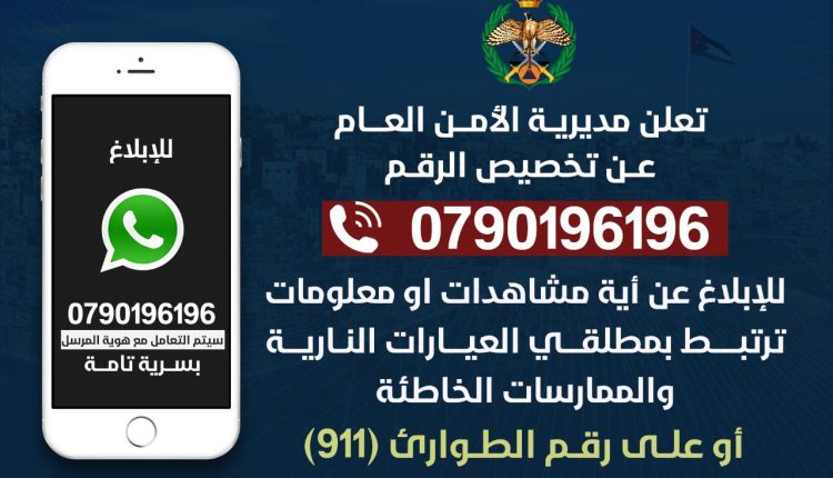 شبكة الشرق الأوسط نيوز :نشرت مديرية الامن العام على صفحتها اليوم الرقم الخاص الذي أعلنت عنه على تطبيق الواتس (0790196196) للإبلاغ عن مطلقي العيارات النارية والممارسات الخاطئة في المناسبات.