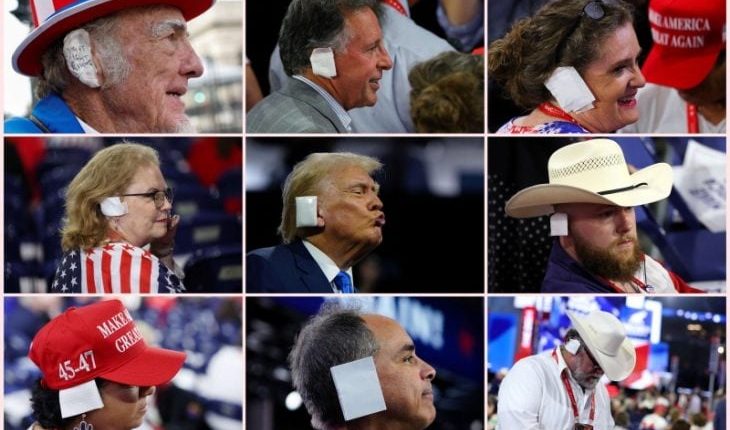 شبكة الشرق الأوسط نيوز : وضع بعض الحاضرين للمؤتمر الوطني للحزب الجمهوري في يومه الثالث، ضمادات على آذانهم أمس الأربعاء، تعبيرا عن التضامن مع الرئيس الأمريكي السابق دونالد ترامب بعد نجاته من محاولة اغتيال.