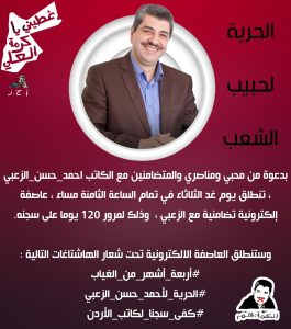 شبكة الشرق الأوسط نيوز : يُطلق محبو الكاتب الصحفي أحمد حسن الزعبي في تمام الساعة الثامنة من مساء اليوم الثلاثاء عاصفة إلكترونية تضامنية مع الزميل الزعبي، وذلك بعد مرور (120) يوما على سجنه.