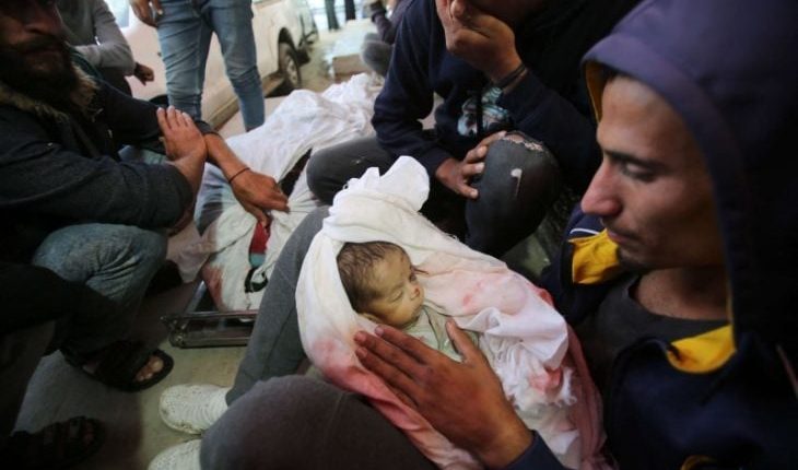 وأظهرت لقطات صورت بعد الاستهداف بوقف قصير رجلا يحمل جثمان طفل رضيع بين يديه ويبكي ويكرر جملة “شو ذنبه (ما ذنبه)”.