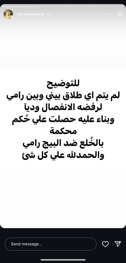 وعلقت مي السنهوري، عقب صدور الحكم عبر صفحتها على موقع التواصل الاجتماعي قائلة: “للتوضيح لم يتم أي طلاق بيني وبين رامي لرفضه الانفصال وديا وبناء عليه حصلت على حكم محكمة بالخلع ضده والحمد لله على كل شيء”.