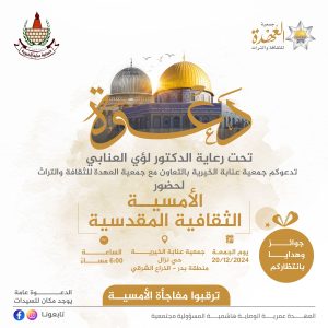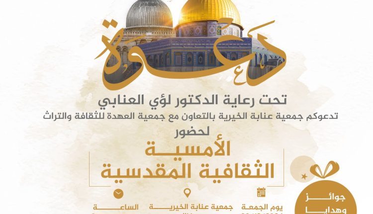 شبكة الشرق الأوسط نيوز : تحت رعاية الدكتور لؤي العنابي، تقيم جمعية عنابة الخيرية وبالتعاون مع جمعية العهدة للثقافة والتراث، الأمسية الثقافية المقدسية والتي ستقام يوم الجمعة الموافق 20/12/2024 تمام الساعة السادسة مساءا في مقر جمعية عنابة الخيرية والكائنة في منطقة حي نزال / الذراع الشرقي، وسيتخلل الأمسية العديد من المفاجات وتوزيع الهدايا.