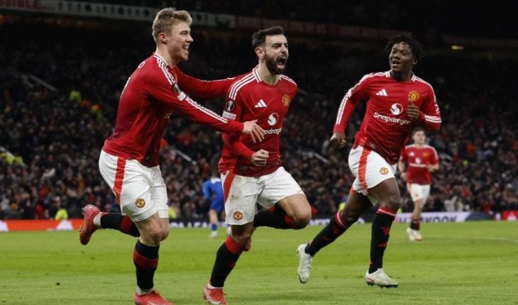 شبكة الشرق الأوسط نيوز : سجل القائد برونو فرنانديز هدفا في اللحظات الأخيرة، ليقود مانشستر يونايتد لفوز ثمين 2-1 على ضيفه رينجرز في الدوري الأوروبي يوم الخميس.