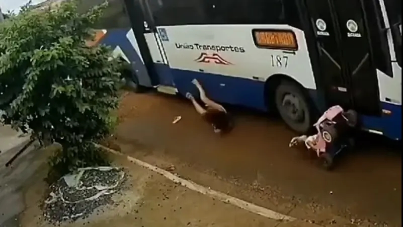 وفي التفاصيل، وفيما كانت امرأة تدفع بعربة طفلتها البالغة من العمر سنتين على طريق عام في البرازيل، انحرفت قليلا لتجنب حفرة، في الوقت الذي مر بجانبها باص كبير فصدمها قليلا لتفقد توازنها وتسقط أرضا بسبب الأرض الموحلة.