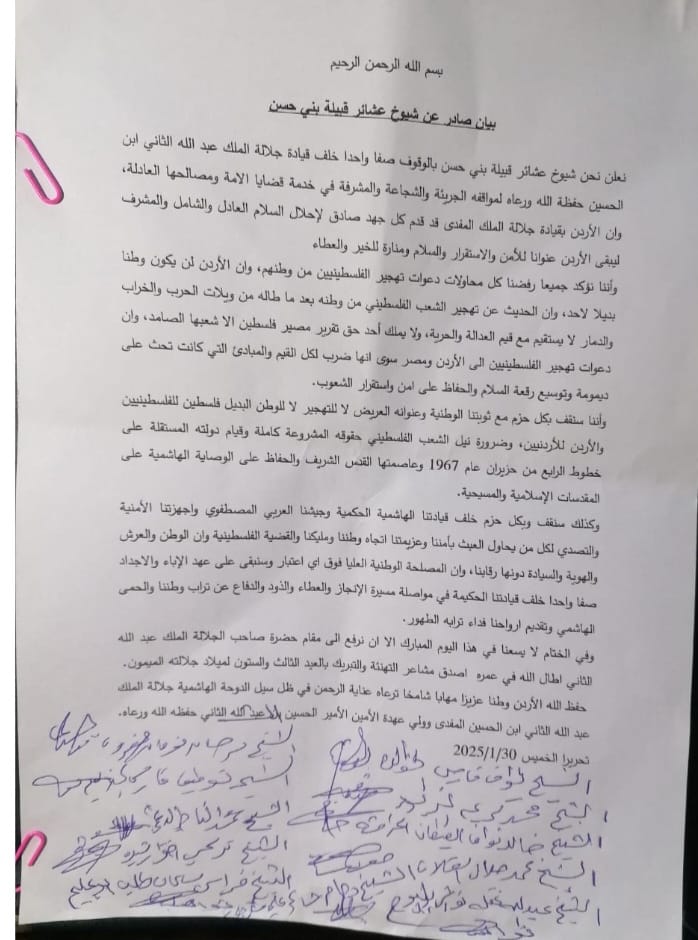 نعلن نحن شيوخ عشائر قبيلة بني حسن بالوقوف صفا واحدا خلف قيادة جلالة الملك عبدالله الثاني ابن الحسين حفظة الله ورعاه لمواقفه الجريئة والشجاعة والمشرفة في خدمة قضايا الامة ومصالحها العادلة، وان الأردن بقيادة جلالة الملك المفدى قد قدم كل جهد صادق لإحلال السلام العادل والشامل والمشرف ليبقى الأردن عنوانا للأمن والاستقرار والسلام ومنارة للخير والعطاء.