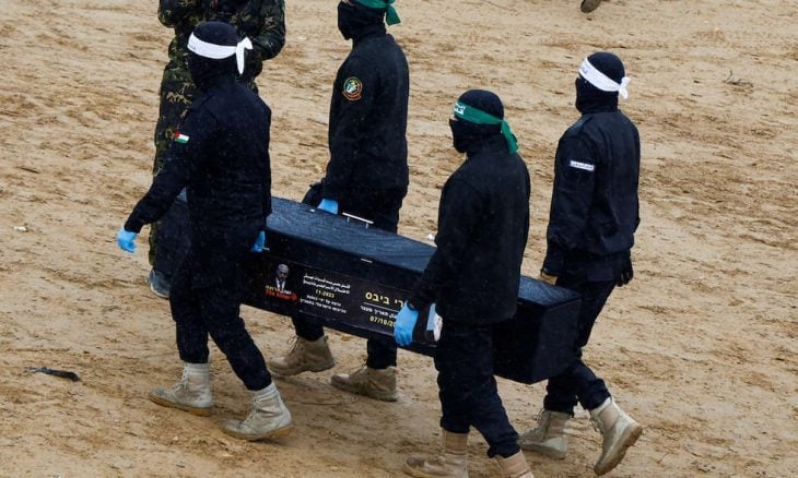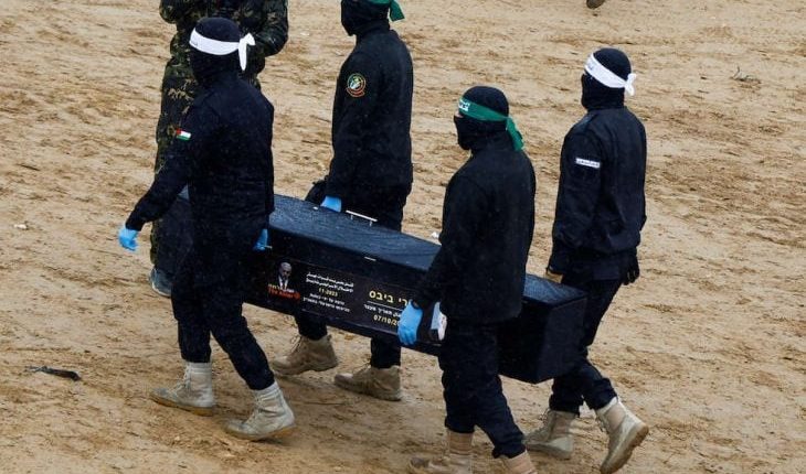 والخميس، سلمت الفصائل الفلسطينية في قطاع غزة 4 توابيت لجثامين أسرى إسرائيليين، وقالت إنها لشيري بيباس وطفليها كفير وأرئيل، والأسير عوديد ليفشتس، وذلك ضمن الدفعة السابعة من المرحلة الأولى باتفاق وقف إطلاق النار الساري.