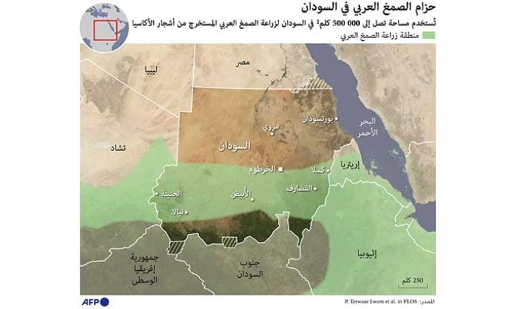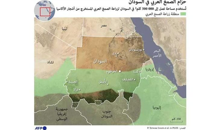 وينتج السودان نحو 80 في المئة من إمدادات الصمغ العربي عالمياً، وهي مادة طبيعية تُستخرج من أشجار السنط (الأكاسيا) وتُستخدم في خلط وتثبيت وتكثيف مُكوِّنات تدخل في صناعة منتجات استهلاكية هامة.