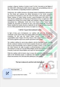 كما يدين التحالف بشدة تصريحات سفير الاحتلال الإسرائيلي في النمسا، التي تدعو إلى عقوبة الإعدام للأطفال واستخدام الحلول العسكرية، مما يشكل خرقًا صارخًا للمادة 6 و37 من اتفاقية حقوق الطفل (CRC)، التي تؤكد على حق الطفل في الحياة وتحظر التعذيب والعقوبات القاسية أو اللاإنسانية.