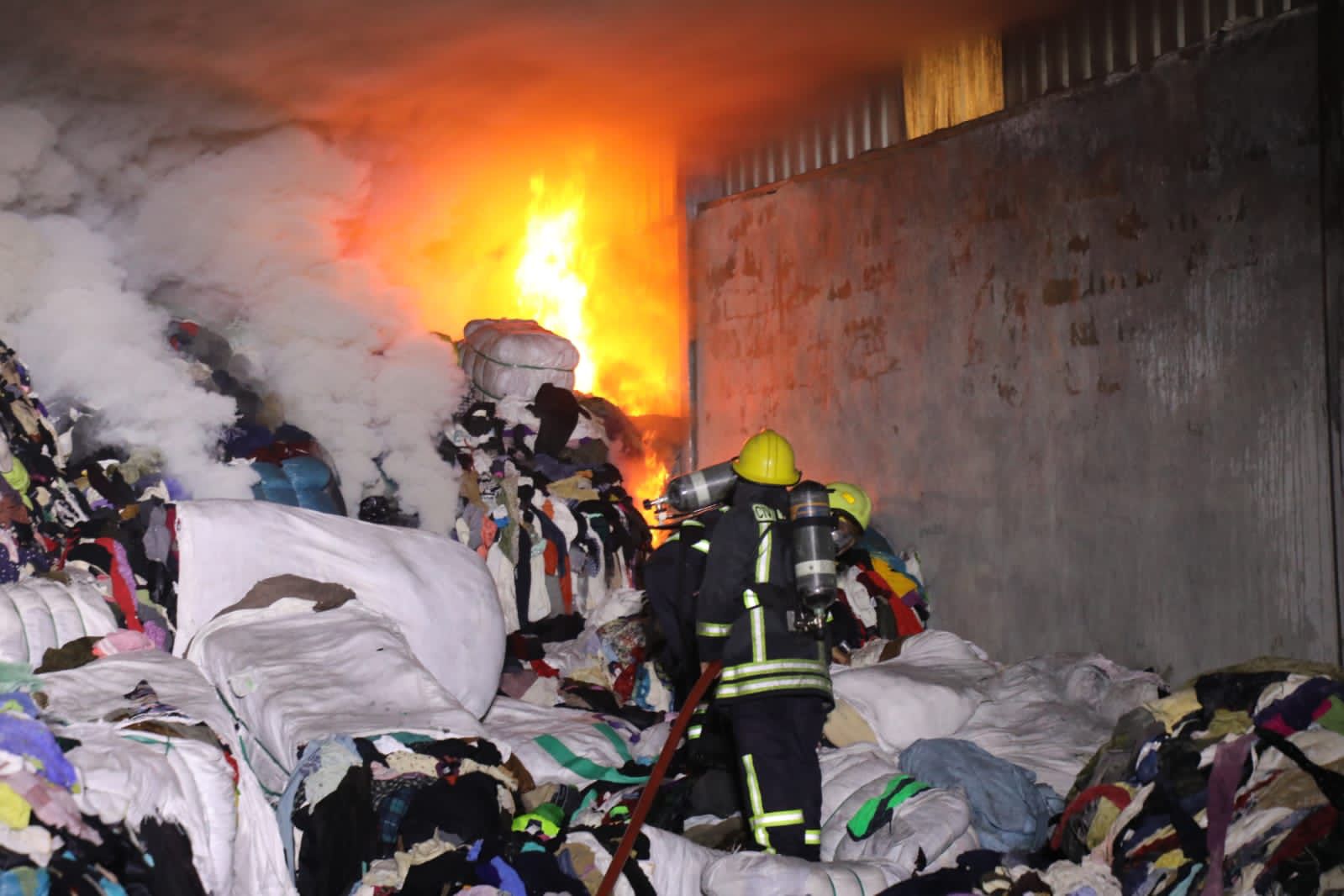 شبكة الشرق الأوسط نيوز : صرح الناطق الإعلامي في مديرية الامن العام بان الكوادر المتخصصة في مديرية دفاع مدني الزرقاء والشرطة تمكنت اليوم من إخماد حريق أتى على هنجر بمساحة (٦٠٠) م٢ تقريبا ؛ يحتوي على أقمشة وملابس مستعملة (باله ) بالمنطقة الحرة في محافظة الزرقاء.