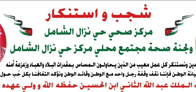 شبكة الشرق الأوسط نيوز : المهندس ” أسعد عزات ” رئيس لجنة صحة مجتمع محلي مركز حي نزال الشامل وأعضاء اللجنة ومدير المركز الدكتور عماد مقداد وكافة العاملين، يستنكرون ويشجبون العمل الإرهابي الجبان للخلية الإرهابية التي عملت على الأراضي الأردنية بتصنيع صواريخ وطائرات درون ،مثمنين دور دائرة المخابرات العامة-فرسان الحق ودورهم بإفشال مخططاتهم ؛ مؤكدين الوقوف خلف القيادة الهاشمية الحكيمة بقيادة جلالة الملك عبدالله الثاني ابن الحسين حفظه الله ورعاه .