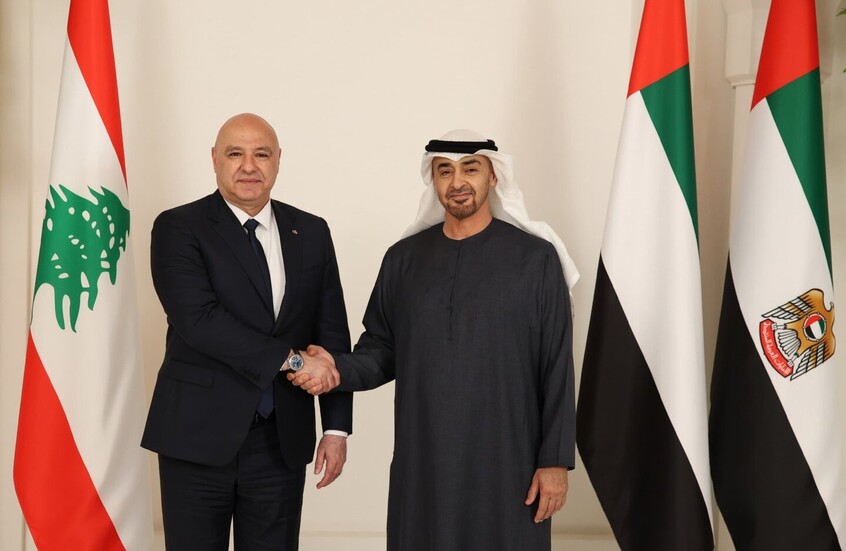 وجاء في البيان المشترك الذي صدر بمناسبة زيارة الرئيس اللبناني جوزيف عون إلى دولة الإمارات أن رئيس الإمارات الشيخ محمد بن زايد آل نهيان عبر عن حرصه على العمل المشترك، وأكد دعم بلاده لأمن واستقرار وسيادة لبنان.